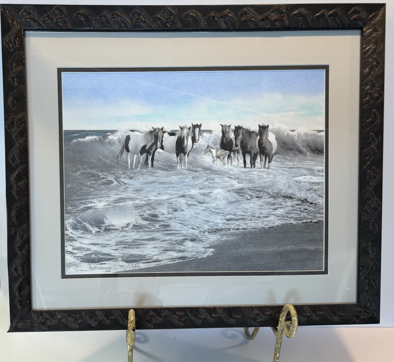 "Assateague Ponies I" is a limited edition lithograph of an original pencil drawing. It is watercolor-embellished by Paul himself, and is framed beautifully in an enhanced black frame. 18x22