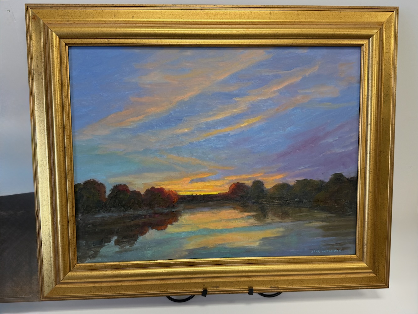 The Golden Hour has arrived on this Autumn evening. The blue sky turns to indigo. The clouds have caught the last of the sunlight creating orange and purple brushstrokes across the sky. A sliver of yellow sunlight draws us in and the river talks back to the sky and says goodbye to the day and hello night. 🍃 Jane Ferguson’s original oil painting “River Reflections” is framed in a timeless gold frame. However, if you would like to talk about reframing it please contact Dawn at dawn@SideStreetFramers.com and she will help you design the perfect frame for you.