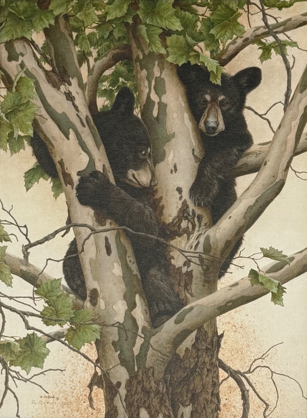 Two black bear cubs climb playfully among the branches, full of curiosity and mischief. Adventure may call, but their protective mother is always nearby, ready to keep them safe. 🍃 Ron Orlando's "Double Trouble" is available as a 12" x 16" giclee on stretched canvas, in a frame designed by the artist himself. 🍃 Each print comes with a Certificate of Authenticity signed by Ron.
