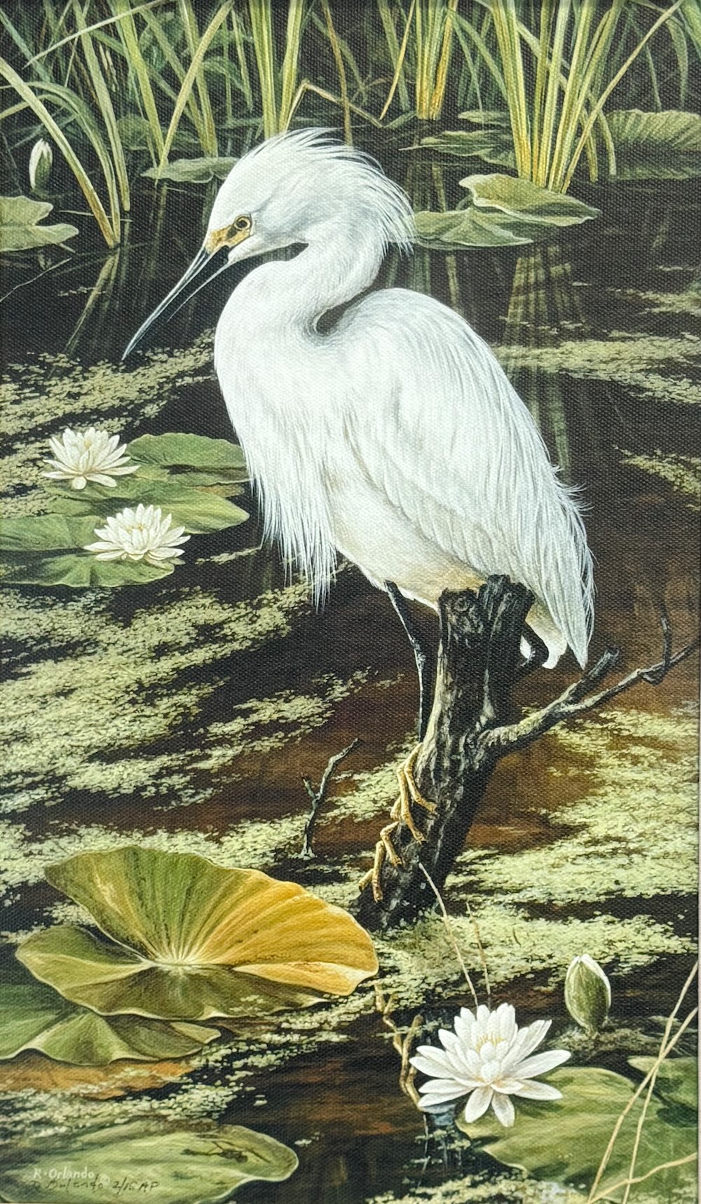 There is grace in stillness, and the egret embodies it to perfection. Her quiet patience allows her to remain unseen until, in a blink, she strikes. From minnows and tadpoles to insects and snails, the pond offers up the next meal to this elegant hunter. 🍃 “Egret in Lily Pond” is available as a 12” x 16” giclee on stretched canvas, in a frame designed by the artist himself. 🍃 Each print comes with a Certificate of Authenticity signed by Ron.